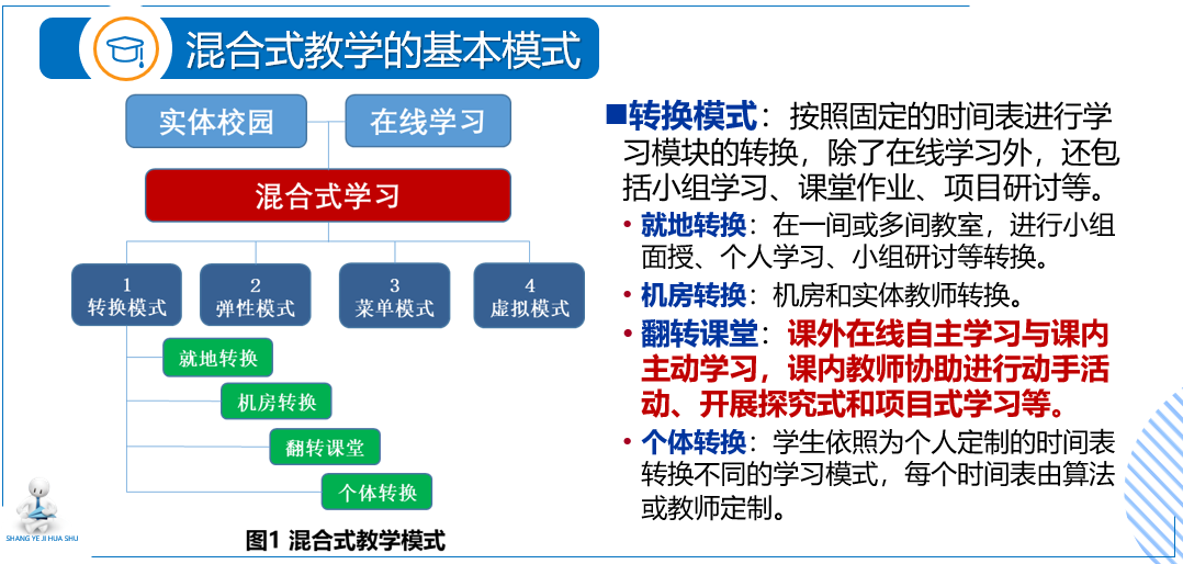 邓立治老师从发现问题开始讲解,总结了传统大学课堂普遍存在的问题,如忽视了学生创新能力和批判性思维的培养,学生在整个学习过程中参与度不够,积极性不高,学习被动等。之后,结合“互联网+”等信息技术,引出了混合式教学这种线上线下深度融合的教学模式,并阐述了它的概念、特点和与传统教学的差异。