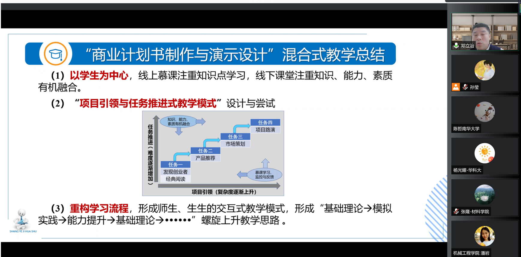 接下来,邓立治老师在介绍“商业计划书制作与演示设计”课程体系的基础上,系统地介绍了该课程进行混合式教学实践探索的过程,包括遵循金课“两性一度”标准,设计和实施了课程“项目引领与任务推荐式教学模式”,并从“以学生为中心”“项目引领与任务推进式教学模式”“重构学习流程”等几方面总结了课程混合式教学改革经验。
