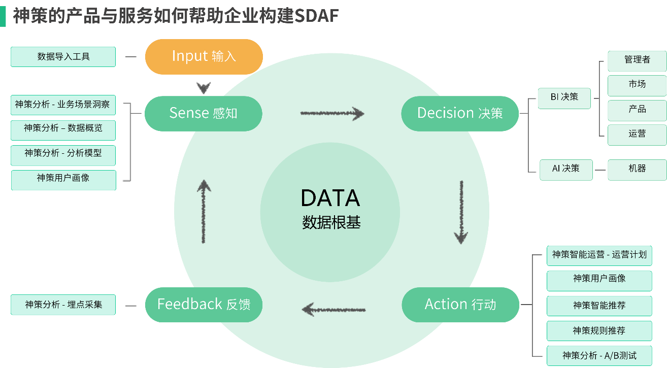 神策数据副总裁王桐首先向北科大师生介绍了神策数据的产品理念——基于数据流的SDAF运营框架,即Sense(感知)、Decision(决策)、Action(行动)、Feedback(反馈)的数据闭环,并致力为客户打造基于SDAF运营框架的数据闭环。每个在客户运营框架中的每个阶段都提供完善的数字化工具,从数据分析、数据决策到触达客户,最终帮助企业实现精细化的运营。