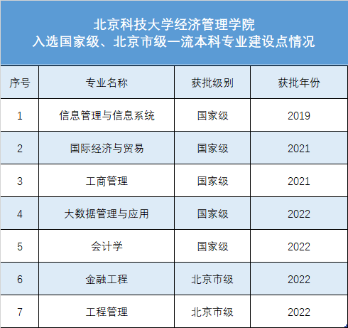 日前,教育部印发《教育部办公厅关于公布2021年度国家级和省级一流本科专业建设点名单的通知》(教高厅函﹝2022﹞14号),正式公布2021年度一流本科专业建设“双万计划”建设点名单。800cc全讯白菜网聽800全讯百菜官方网站大数据管理与应用、会计学专业获批2021年度国家级一流本科专业建设点,金融工程、工程管理专业获批2021年度北京市级一流本科专业建设点。至此,学院7个本科专业全部获批一流本科专业建设点,其中5个专业获批国家级一流本科专业建设点、2个专业获批北京市级一流本科专业建设点。