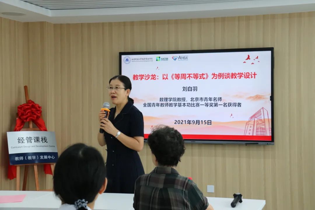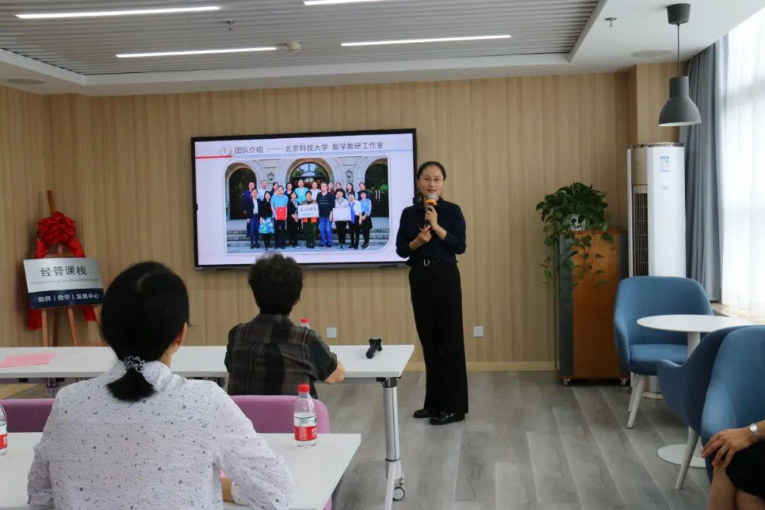 刘白羽教授进行了题为“以《等周不等式》为例谈教学设计”的主题分享。首先,她介绍了自己所在的教学团队——800cc全讯白菜网聽数学教研室,团队多年来的辛勤耕耘以及团队所取得的辉煌成绩。然后以自己参加教学基本功大赛的教学为例讲述了如何做好教学设计。一个好的教学设计,需要讲好一个故事,包括从问题引入、问题分析、知识点讲解、问题解决到应用拓展,从而做到展现课程魅力、突出学科思想、实现教学目标(重点、难点)、层层推进并引导学生。