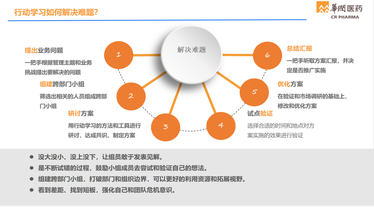 张博士强调,行动学习的本质,是从实际管理情境出发,以解决问题为目的循环往复体验学习。这种方法之所以有效,是因为学习的全过程从计划、实施、总结、反思、复盘,各环节经过了事先设计;参与者能在学习过程中相互学习和共同提高,组织也通过行动学习达到解决问题的目的。例如,华润集团下属医药板块结合“创新转型、质量发展”管理主题,应用行动学习法解决了润药经理人共通面对的主要工作问题和挑战。