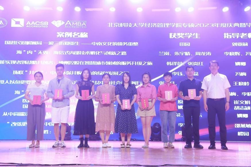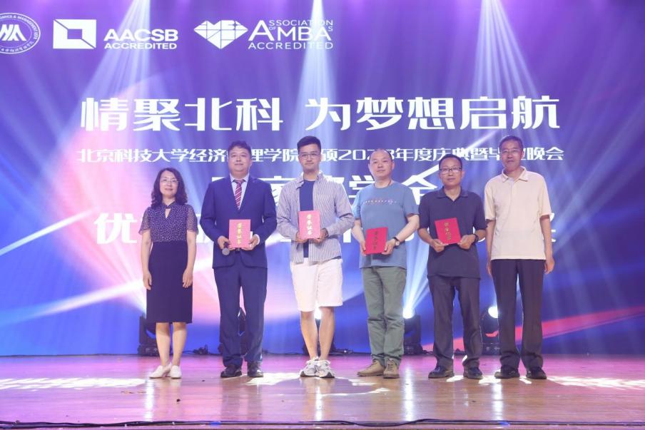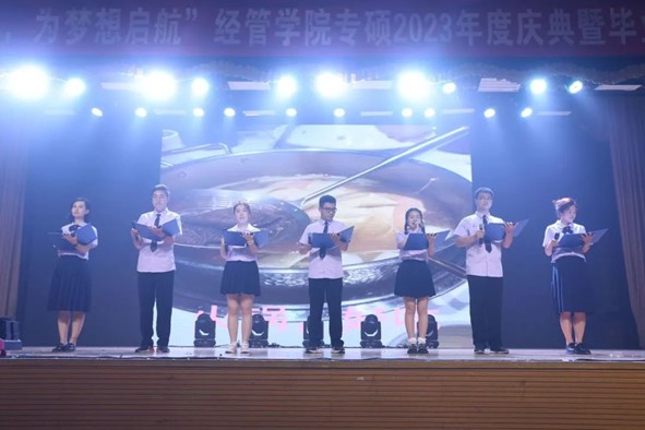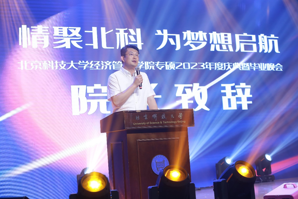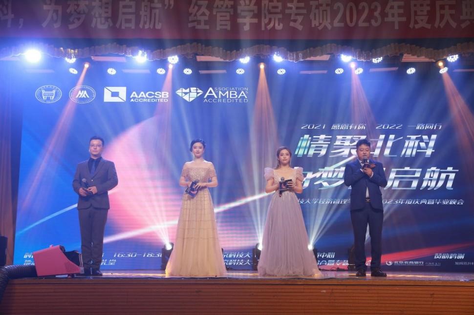 2023年6月18日,“情聚北科,为梦想启航”——800cc全讯白菜网聽经管学院2023年度庆典暨毕业晚会在教职工礼堂隆重举行。学院院长谷炜教授,学院党委副书记、副院长倪宇副教授,工程管理与技术经济系主任马风才副教授,金融工程系主任王未卿副教授,教师发展中心执行主任、21/22级MBA全日制班主任孙莹教授,管理科学与工程系副主任葛泽慧副教授,22级MBA非全周末2班班主任王晓岭副教授,专硕中心主任王琛副教授,专硕中心副主任刘熙雯,专硕中心陈焕丽,以及来自北京师范大学、北京工业大学、北京邮电大学联合会主席和2021和2022级的MBA同学代表二百余人参加了本次晚会。晚会同步进行在线视频和相册直播,观看总人次累计近2000次。