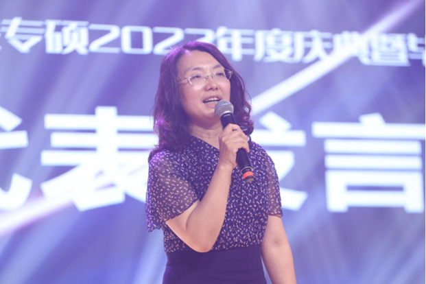 金融工程系主任王未卿老师作为教师代表发言,她首先肯定了疫情期间学生们的坚持学习的表现,赞扬了学生们线上线下结合的活动方式,并表示今后专硕中心会在背后默默支持每一位同学。最后在这个对每一个同学都很重要的时刻,王未卿老师祝福大家,未来的日子里乘风破浪,砥砺前行,保持热爱,追求未来的光荣与梦想。