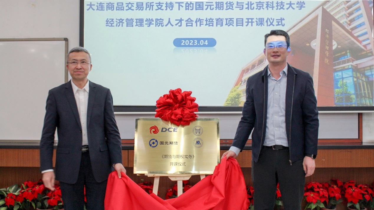 在全场嘉宾和师生共同见证下,谷炜和郭科一同为此次人才合作培育项目《期货与期权实务》课程开课揭幕。