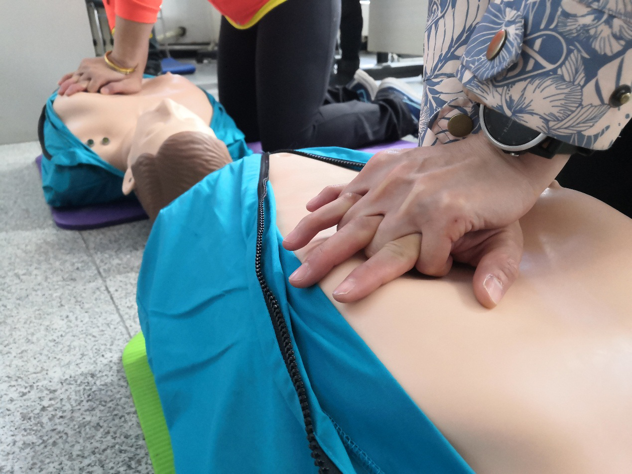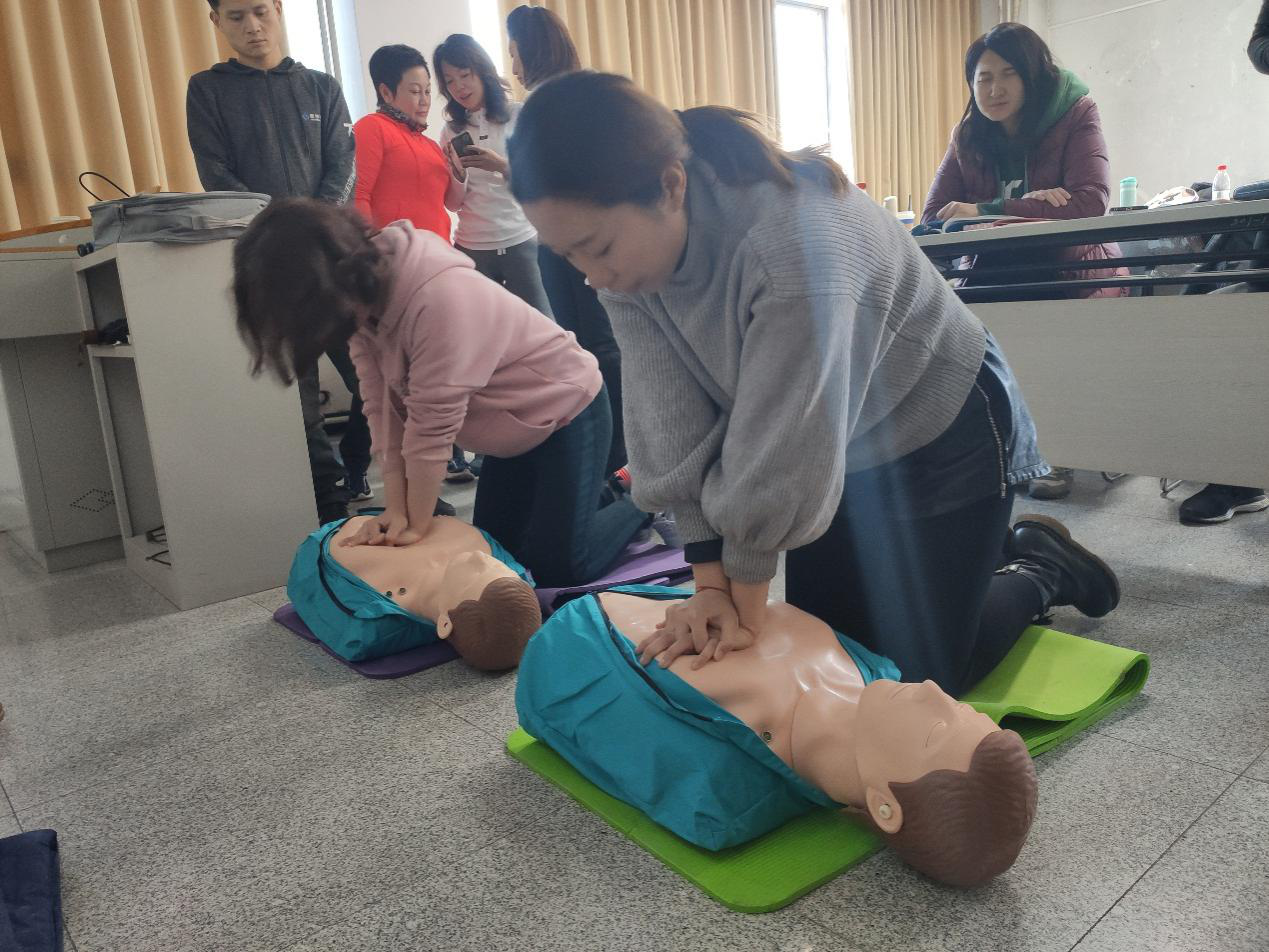 何润宇老师、张东刚在朱青竹老师的指导下进行心肺复苏练习