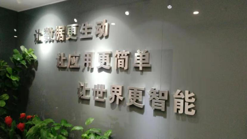 走进公司大门,首先映入眼帘的就是墙壁上的公司愿景:让数据更生动,让应用更简单,让世界更智能,与公司的业务高度契合。