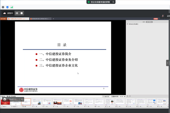 随后,李强总介绍了中信建投的历史发展历程,公司主要业务范围,师生从中了解到中信建投是国内行业领先的综合性证券公司,公司开展业务齐全,尤其是投资银行业务,常年位居国内前三甲,财富理财产品也十分丰富,且富有竞争力。此外,李强总还具体介绍了投行业务、固收业务、证券经纪业务、资管业务、证券金融业务、机构业务、研究业务、公司企业文化体系等。
