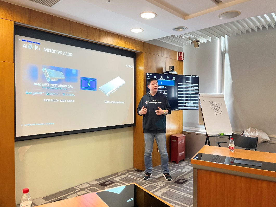 在座谈会中,校企双方围绕AMD的显卡业务为背景开展讨论,由Peter Luan(Software Manager)介绍了当下最前沿的设备软件技术,而后由Wang Guopeng(FAE:Field Application Engineer)对信创产业和ChatGPT进行了介绍。我院多名同学就相关领域问题进行了提问,双方进行了深入的交流讨论。