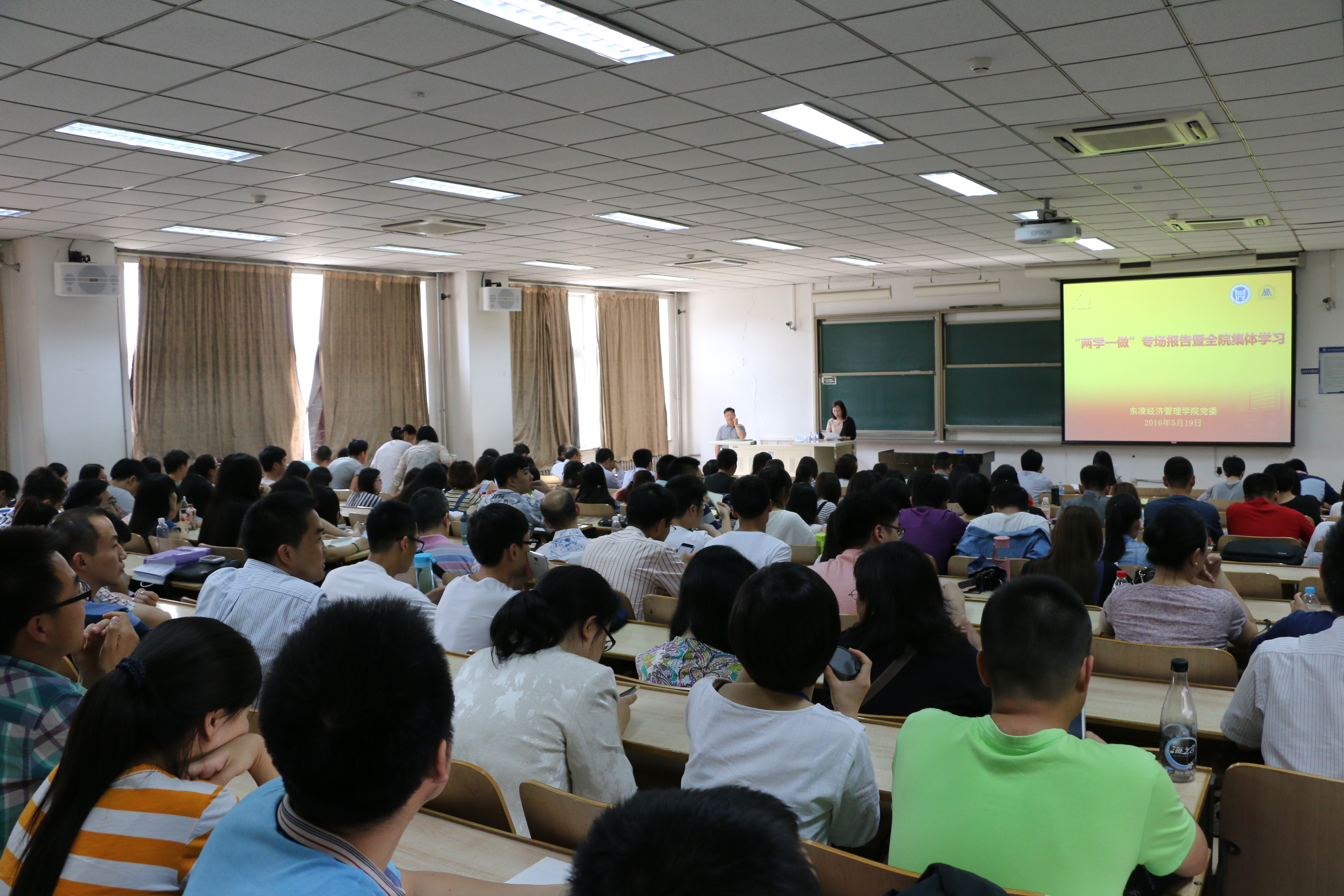 为推动全面从严治党向基层延伸,巩固拓展党的群众路线教育实践活动和“三严三实”专题教育成果,贯彻落实学校党委关于在全体党员中开展“学党章党规、学系列讲话,做合格党员”学习教育的工作部署,5月19日下午,东凌800全讯百菜官方网站“两学一做”专场报告暨全院集体学习在逸夫楼105举行,学院党政领导班子成员、党委委员、全体教职工和学生党员代表参加了学习,学院党委书记戴淑芬主持学习会。
