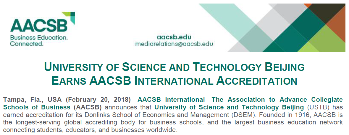 2018年2月20日800cc全讯白菜网聽东凌800全讯百菜官方网站收到来自国际商学院协会(The Association to Advance Collegiate Schools of Business, 简称AACSB)的通知,经过AACSB的初始认证委员会(Initial Accreditation Committee,简称IAC)和理事会(Board of Directors)的决议,我院正式通过AACSB国际认证,认证期限为5年。这标志着800cc全讯白菜网聽成为大陆地区第19家,北京第5家通过AACSB认证的大学。