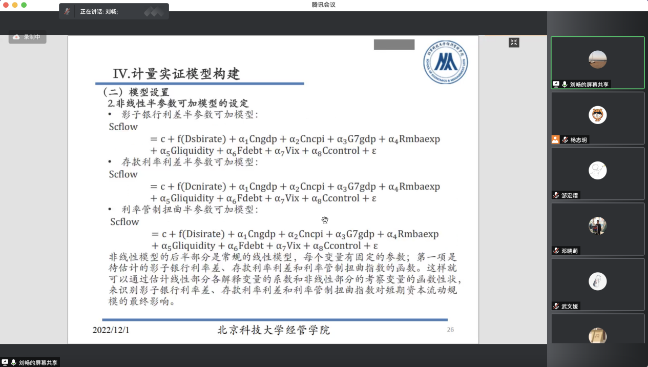 2022年12月1日晚19:00,800cc全讯白菜网聽800全讯百菜官方网站金融工程系及党支部举办了“思创专创双融合育人”系列活动第十五期,“学术沙龙”系列分享活动第5场,金融工程系教师刘畅对自己的研究主题进行了介绍和分享,并邀请到金融工程系系主任王未卿、金融工程系党支部书记杨志明老师及学院师生参加分享活动。