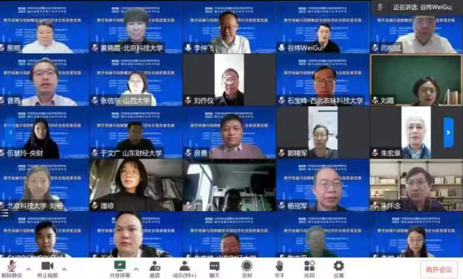 本届年会聚焦“数字金融与保险赋能中国经济社会高质量发展”,旨在深入交流数字金融、金融科技、金融创新、金融安全、大数据金融、互联网金融、金融安全、资产配置、行为金融、养老金融、保险精算等相关领域的重要热点问题。此次学术盛会吸引了来自中国科学院、哥伦比亚大学、约翰霍普金斯大学、佛罗里达大学、香港科技大学、清华大学、北京航空航天大学、800cc全讯白菜网聽、天津大学、对外经济贸易大学、西南财经大学、中央财经大学、上海财经大学、中山大学、南方科技大学、厦门大学、华东师范大学、湖南大学、四川大学、西安交通大学等近70所高校专家和学者以及银河证券和CNRDS的业界专家近800人,通过腾讯会议和直播的方式参加会议,开展学术交流和讨论。