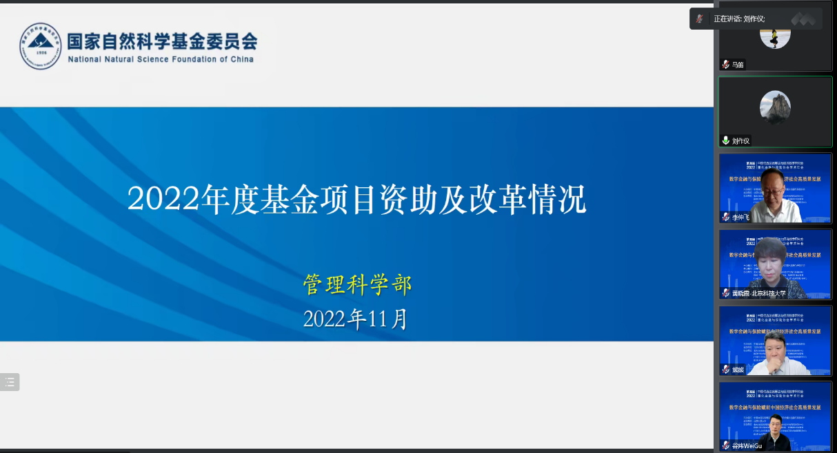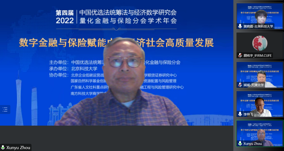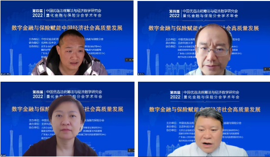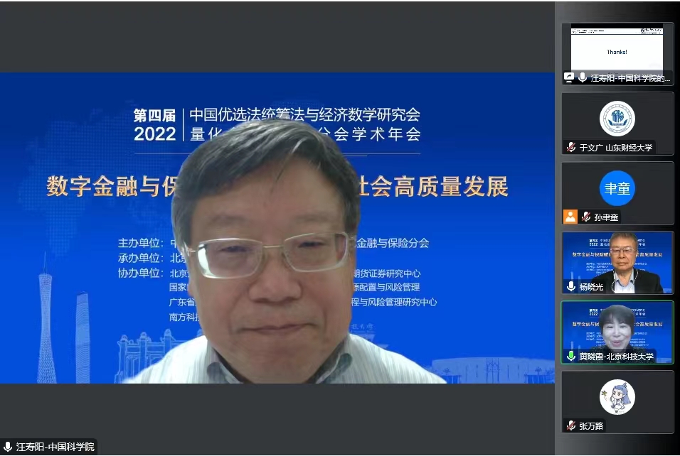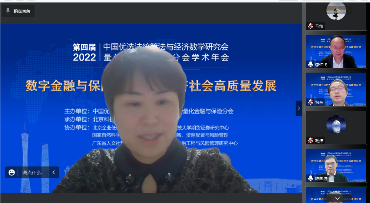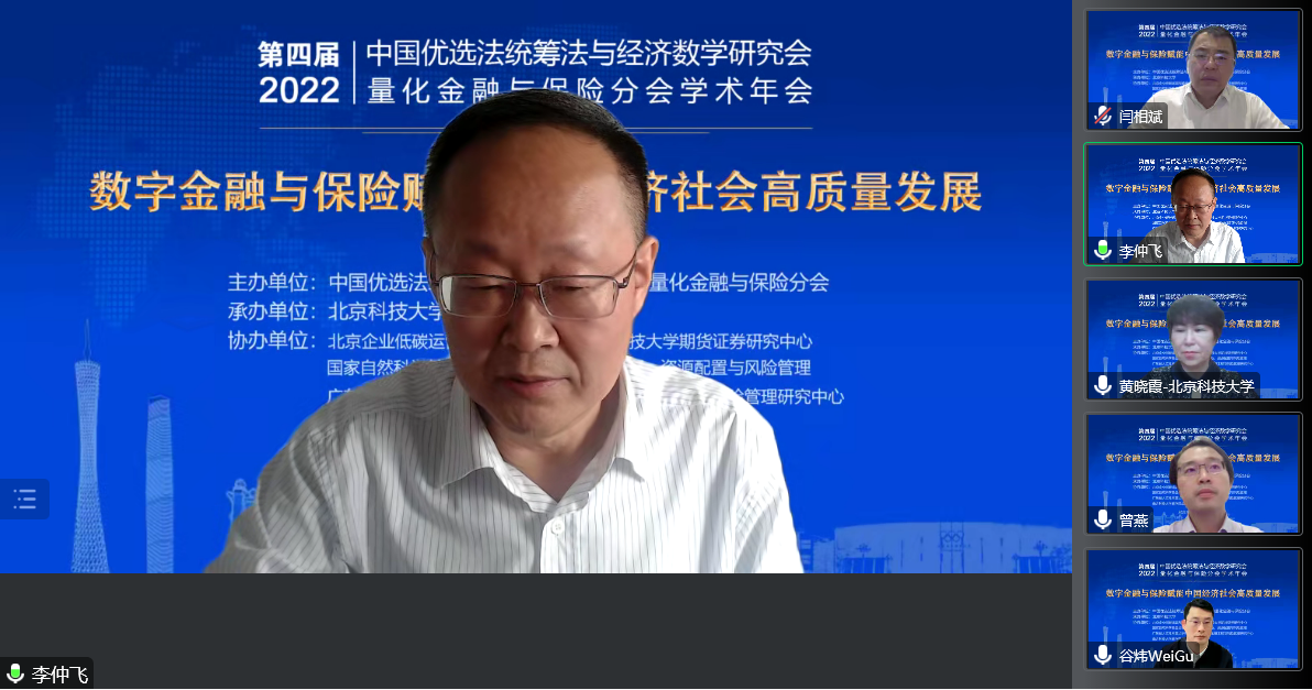 开幕式后,由国家自然科学基金委管理科学部副主任刘作仪、哥伦比亚大学的周迅宇教授、中国科学院的汪寿阳院士和中国科学院系统科学研究所副所长杨晓光研究员作大会报告。首先,刘作仪主任作了题为《2022年度基金项目资助及改革情况》的大会报告,详细介绍了2022年度管理学部基金资助情况和改革情况。然后,周迅宇教授作了题为《ReinforcementLearninginContinuousTimewithFinancialApplications》的大会报告,介绍了无模型连续时间强化学习及其在金融资产管理中的应用。上半场大会报告由大会主席李仲飞理事长主持。汪寿阳教授作了题为《加密货币的几个问题》的大会报告,从比特币挖矿谈起,通过几个案例来分析数字经济时代风险管理的一些新问题,并针对这些新问题,提出新理论、新方法与新技术,促进数字经济风险管理理论的研究与发展。最后,杨晓光研究员作了题为《数字经济的内在逻辑》的大会报告,报告指出了从卖方经济到买方经济的人类行为的变化,使得互联网和信息技术全面赋能经济各个环节,并阐述了数字经济的经济产出中市场和数据要素的重要性。下半场大会报告由800cc全讯白菜网聽800全讯百菜官方网站副院长黄晓霞教授主持。大会报告内容丰富、精彩纷呈,为参会人员呈现了一场量化金融与保险前沿研究的思想盛宴。大会报告期间通过腾讯会议参与大会报告学习讨论的人数达到了300上限,同时还有近500人通过线上直播的方式参与大会报告的学习。