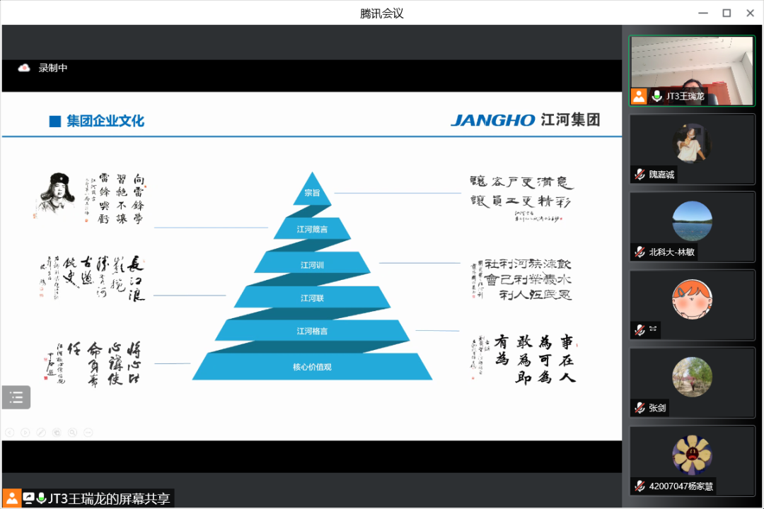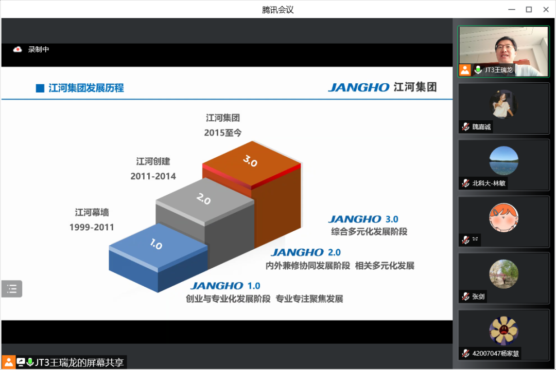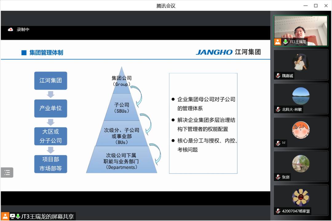 7月19日上午,江河集团行政人事总监王瑞龙应邀参加800cc全讯白菜网聽800全讯百菜官方网站工商管理系2020级企业认识与实践的认识实习,并为同学们精心介绍江河集团的管理体系和人力资源管理模式。本次认识实习共三部分,首先是王总为同学带来主题讲座,其次由集团的部门负责人带领同学在线参观集团的北京工厂与成都公司办公环境,最后由王总与各位同学老师交流互动。工商管理系林敏老师担任主持人,工商管理系系主任张剑,何润宇、尹奎等老师与工商管理系20级全体本科生出席本次活动。